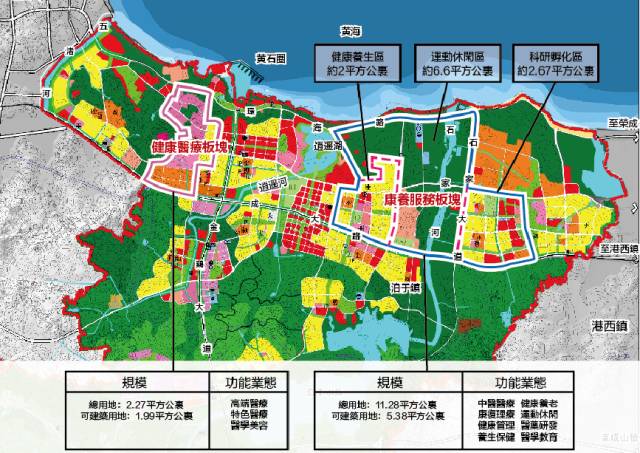 位于威海东部滨海新城,分为康养服务和健康医疗两大板块,总面积13.33平方公里,其中,建设用地7.33平方公里。康养服务板块,总面积11.28平方公里,建设用地5.38平方公里,分为健康养生区、运动休闲区、科研服务区三个功能区。健康医疗板块,总面积2.27平方公里,建设用地1.99平方公里,重点发展高端医疗、特色医疗、医学美容等产业。